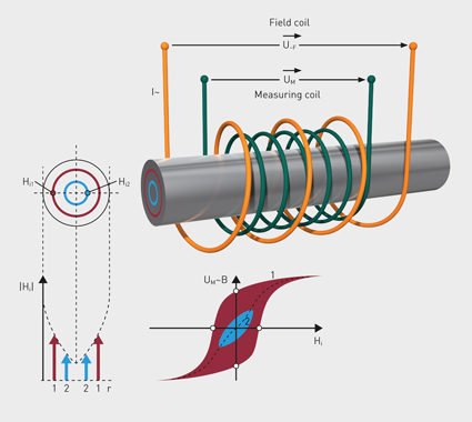 測定コイルの受信コイルで、試験する材料の導電率(電気特性値)およびヒステリシス曲線(磁気特性値)の大きさや形状に依存して発生する電圧を測定する。その電圧の評価によって強磁性材、オーステナイト鋼および非鉄金属の検査を可能にします。