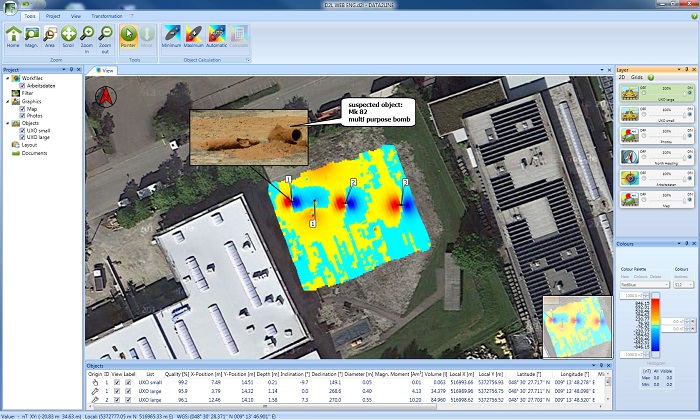 Das UXO Auswertungsmodul verfügt über eine sehr genaue Objektkalkulation u.a. zur Bestimmung der Lage, Tiefe und Größe von Anomalien.