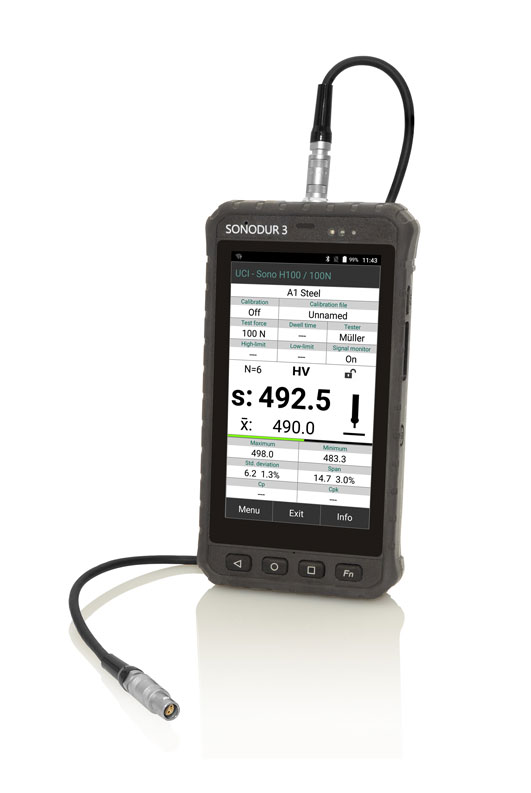 Das SONODUR 3 beherrscht die Auswertungen der Härteprüfverfahren UCI (Ultrasonic Contact Impedance) und die Rückprall-Härteprüfung nach Leeb.