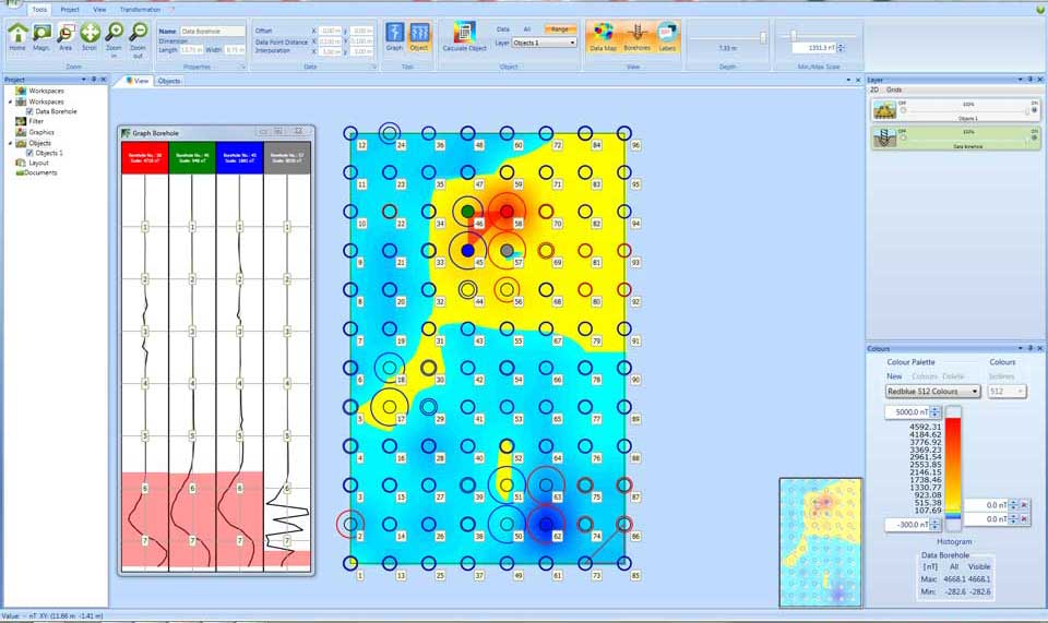 DATA2LINE BMモジュールは、鉛直探査掘削孔で記録された地磁気データから地磁気異常点の正確な位置、深さおよび大きさを評価するソフトウェアです。