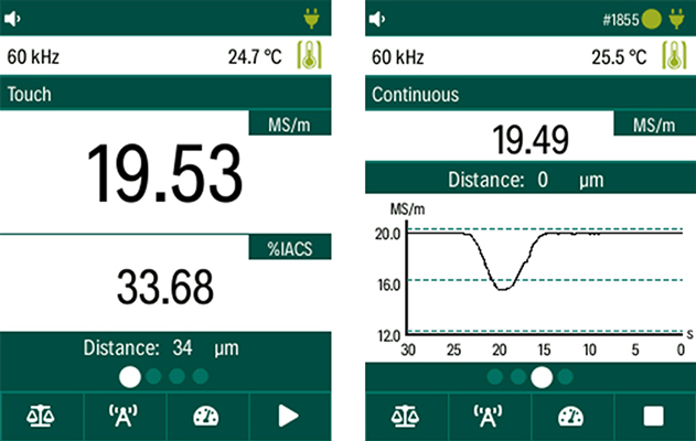SIGMATEST 2.070は、タッチモード(TOUCH)または連続モード(CONTINUOUS)で操作することができます。表面をスキャンして測定値をタイムチャートで表示するには連続モードを使用し、単一の値を測定するにはタッチモードを使用します。すべての測定値を保存するには、記録機能を使用します。